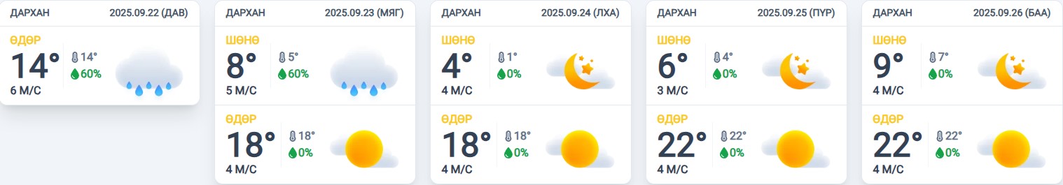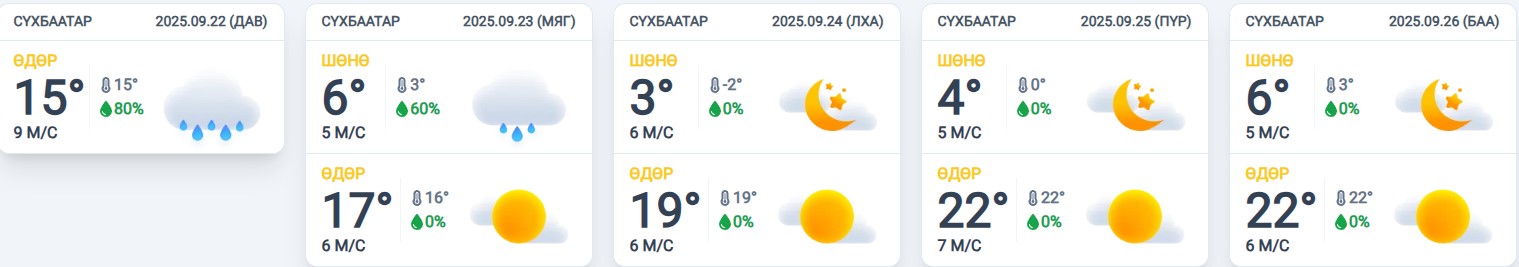 09 дүгээр сарын 22-нд нутгийн төв хэсгээр, 23-нд нутгийн зүүн хагаст бороо, уулаараа нойтон цас орж, сэрүүхэн байна. 24-нөөс баруун аймгуудын нутгаар цаашдаа ихэнх нутгаар өдөртөө дулаарна.